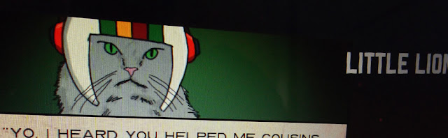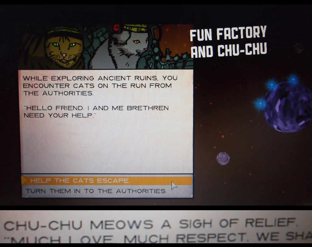 You start a game, usually with a selection of the white-lit, occasionally-safe planets, and red-lit planets which (so far as I've seen) always mean battle. Visiting a planet means a randomly-drawn card, which shows you a chunk of your procedurally-generated story. Think Choose Your Own Adventure. Help out Fun Factory and Chu-Chu, and you may eventually meet Little Lion.